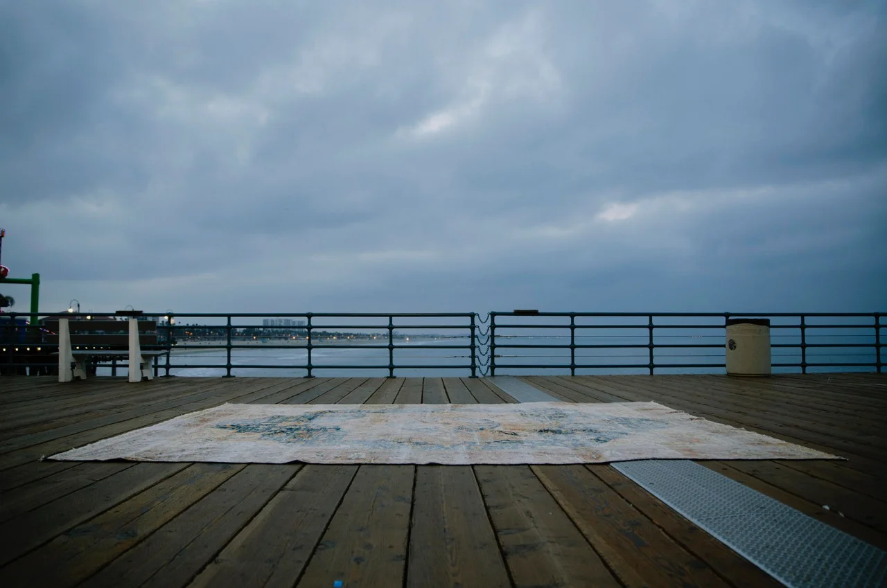 In this body of work, artist Cole Sternberg, working with LAXART, creates a series of unique hand-painted rugs. Each rug is selected by Sternberg, painted by the artist and exposed to the elements of Los Angeles. The works decay, fade and take on additional abstract components as they are affected by human and natural elements. For instance, an early 20th century India rug is pounded by the waves on the rocks of Point Dume in Malibu, while others are tramped on the sidewalks of downtown, chlorinated at the bottom of a Hollywood Hills pool and wine-stained at a Griffith Park beggars’ banquet.